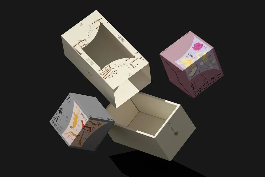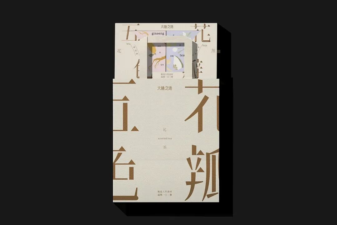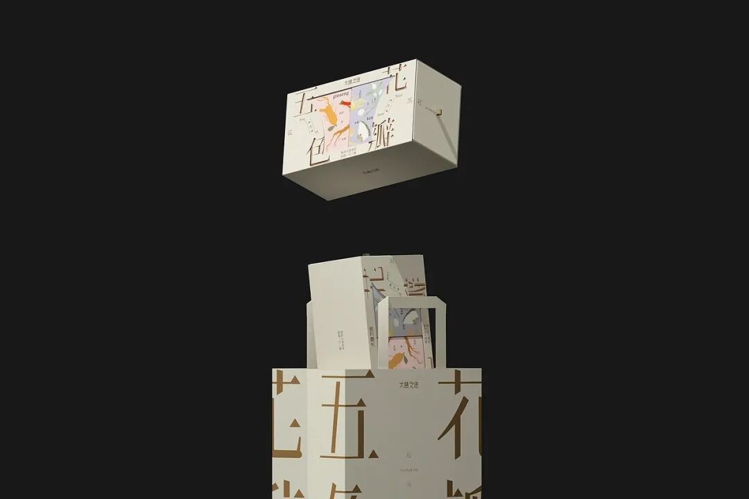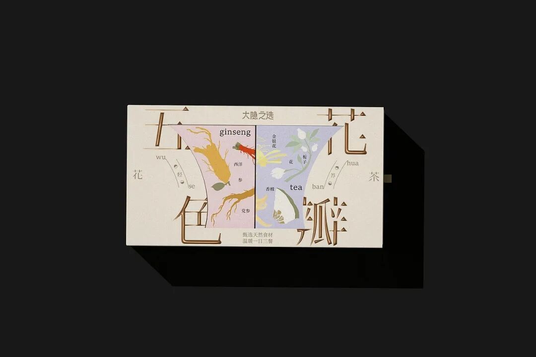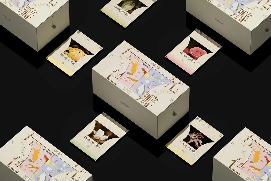 包装方面,从五行养身理念出发,将青红白黑黄这五色与花瓣等元素融入视觉设计,通过字体解构、色调克制等方式,传递传统养生智慧的品牌主张,激发年轻消费者对东方文化的情感共鸣。此外,外盒包装结构层次丰富,且在分装盒上加入关于产品的相关信息,兼具仪式感和实用性,契合年轻人对精致养生的追求。采用质感纸张与简约线条,弱化商业包装的浮躁感,以雅致感塑造品牌的高端调性,打破年轻群体对养生茶 “老气” 的刻板印象。