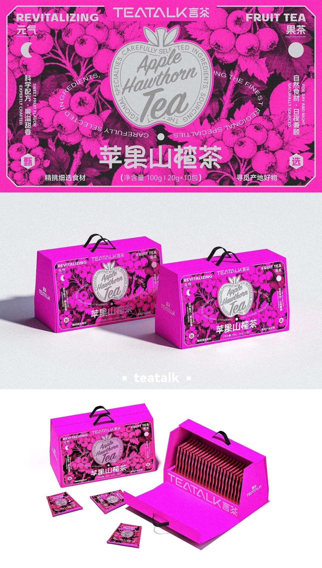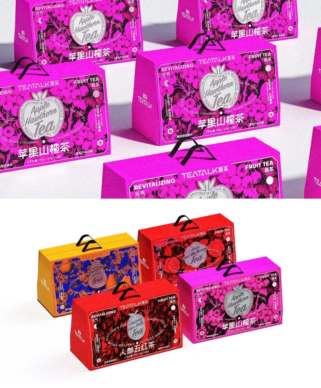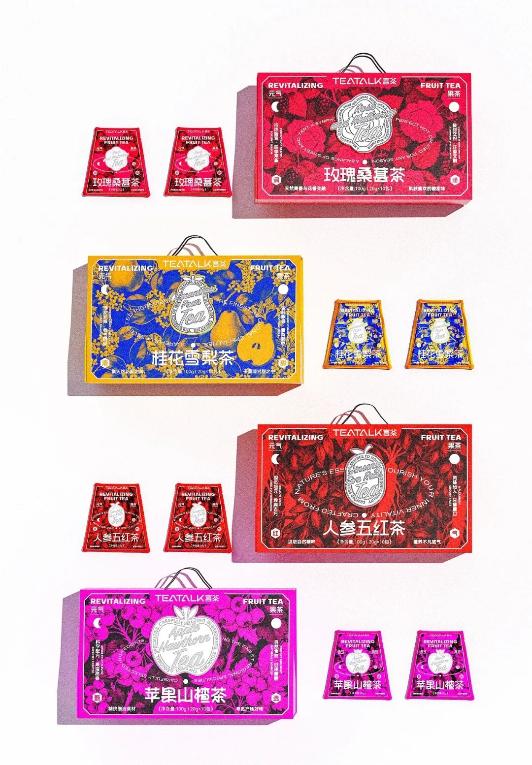 包装方面,整体以玫红、亮黄等高饱和色彩为主色调,跳脱出传统养生茶的素雅色调,精准击中年轻消费者对潮流感与天然感的双重需求。主视觉则将苹果山楂、桂花雪梨等食材以写实插画形式铺满包装,直挂传递产品真材实料的优势,同时通过丰富的视觉层次营造出美式复古的潮流质感,模糊“养生”与“时尚”的边界。