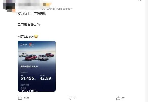但没有华为品牌光环加持,它的市场表现远不如问界。两者的鲜明对比,足以说明华为对赛力斯的重要性。