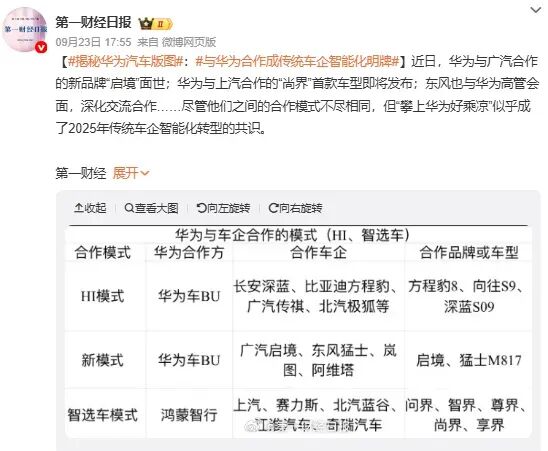 对于很多车企来说,借力华为这样的科技巨头,是快速实现智能化升级的最优解。