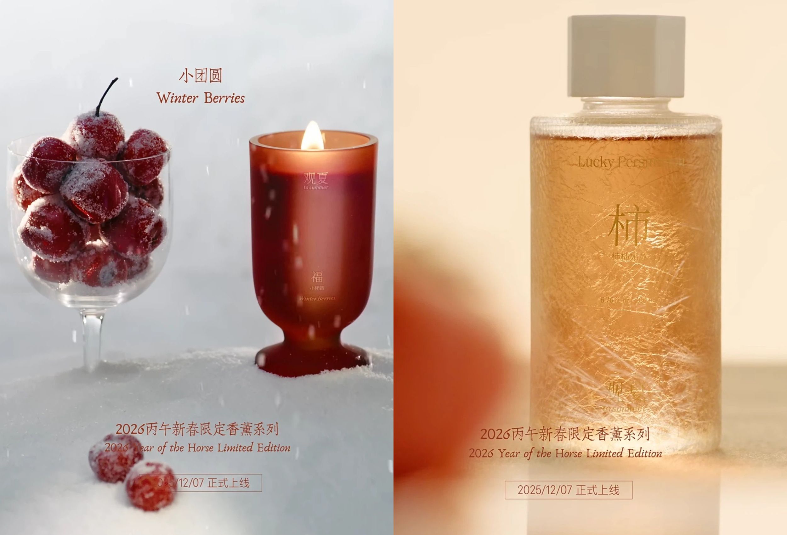 2026,观夏以“少年游”为寄愿,推出三大新春限定系列,包含「柿柿如意」、「春日庭院」和「小团圆」,以及限定生肖精油香薰蜡烛礼盒。