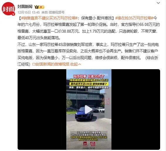 红星新闻:《30万级的玛莎拉蒂,两天被抢光!经销商:6点下班,被客户堵到9点知情人士:卖一辆亏一辆,不降价也不行》