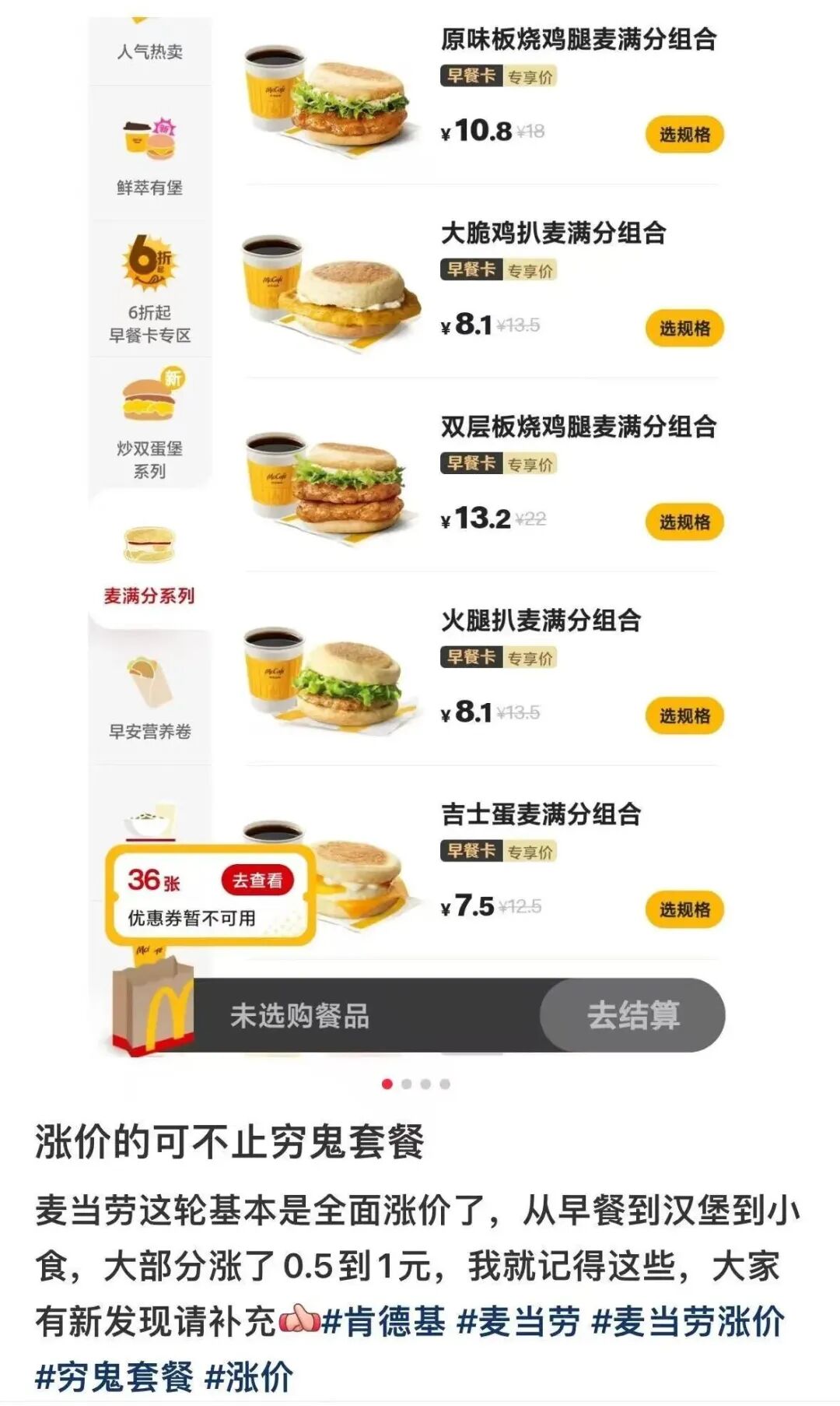 双层吉士汉堡涨1元,巨无霸跟涨1元,麦麦脆汁鸡、中份薯条和麦旋风等甜品则统一上调0.5元。这几毛钱的变动,却让年轻人的早餐预算瞬间失衡。