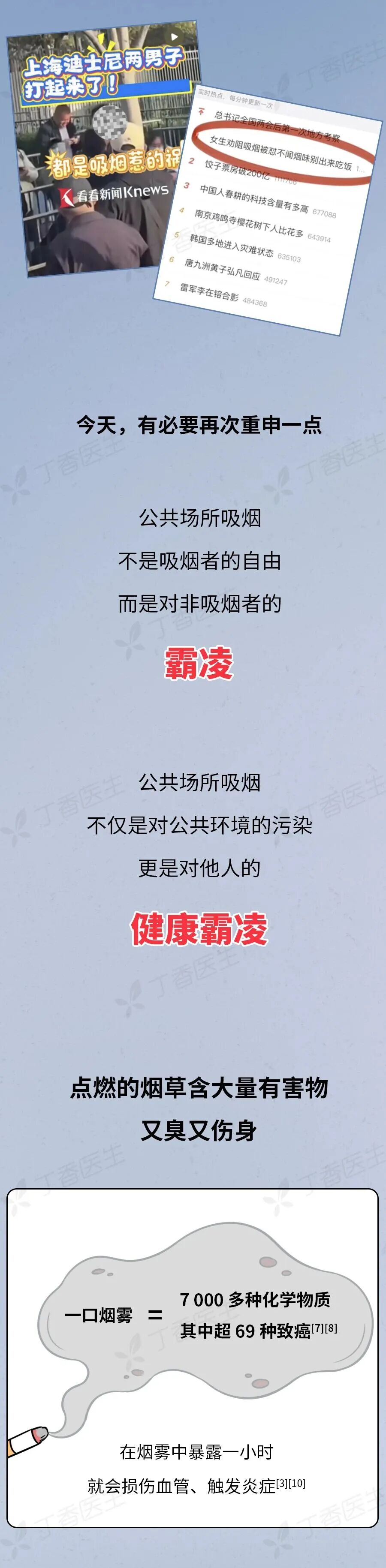 丁香医生有篇文章说得挺到位,它说“公众场所吸烟不是吸烟者的自由,而是对非吸烟者的霸凌;公共场所吸烟,不仅是对公共环境的污染,更是对他人的健康霸凌”。