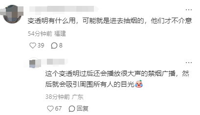 有人担心光透明还不够,“这个变透明过后还会播放很大声的禁烟广播,然后就会吸引周围所有人的目光”。