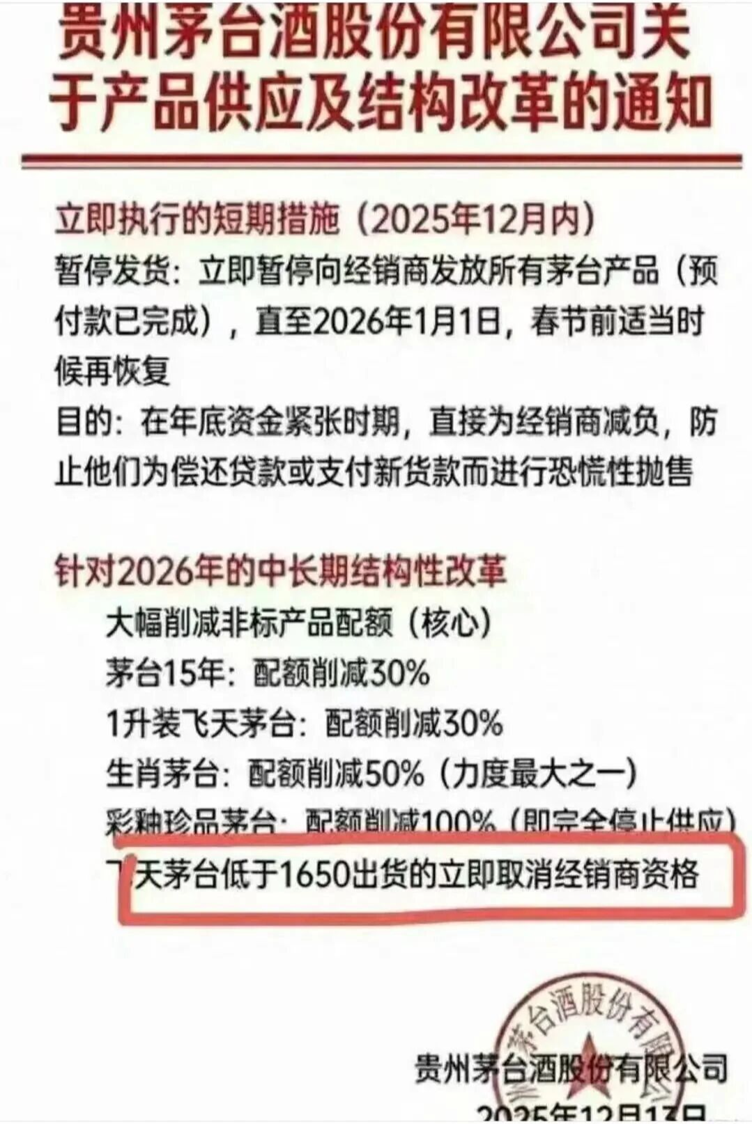 该文件明确要求,2026年1月1日前暂停所有茅台产品发货,且飞天茅台出货价不得低于1650元,违者将被取消经销商资格;