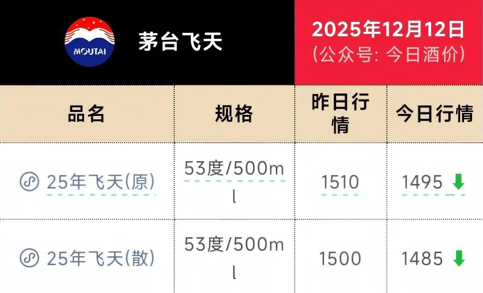 12月12日,53度飞天茅台散瓶批发价跌至1485元,原箱价1495元,双双跌破1499元官方指导价,创下单年价格新低。