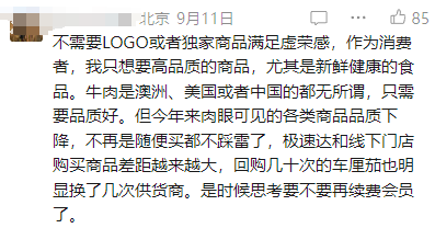 有会员表示,“牛肉是澳洲、美国或者中国的都无所谓,只需要品质好。但今年来肉眼可见的各类商品品质下降,不再是随便买都不踩雷了,极速达和线下门店购买商品差距越来越大……”