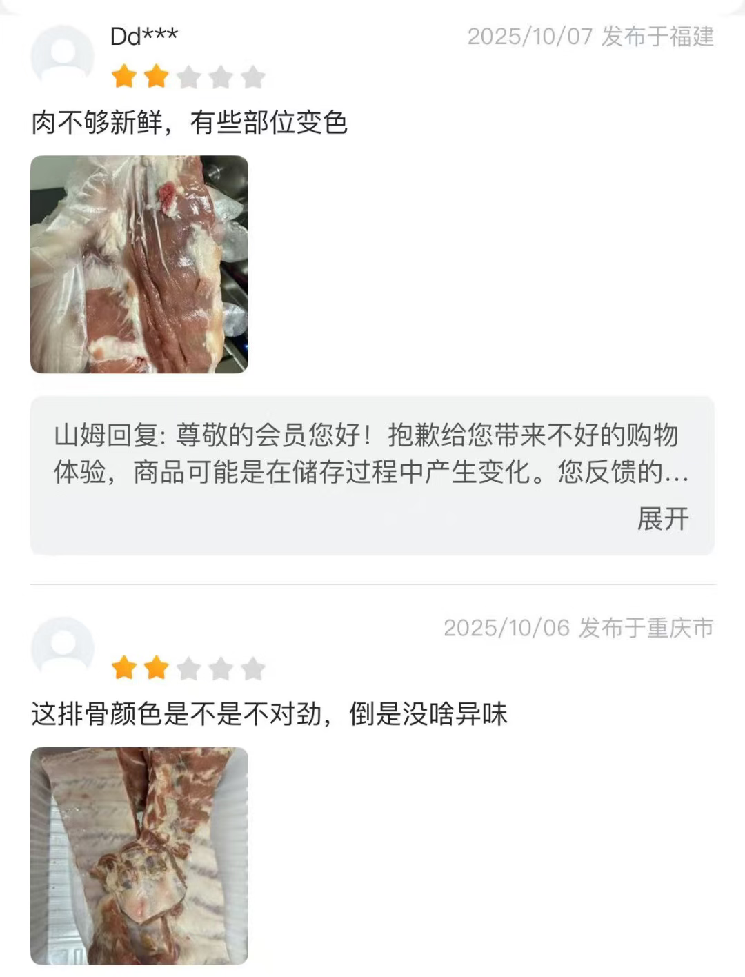 肉禽柜台,以前被夸上天的猪肋排,在10月份被上海市民王先生吐槽散发着难闻气味,山姆App内也有不少会员反馈存在品质差、肉不新鲜等问题。