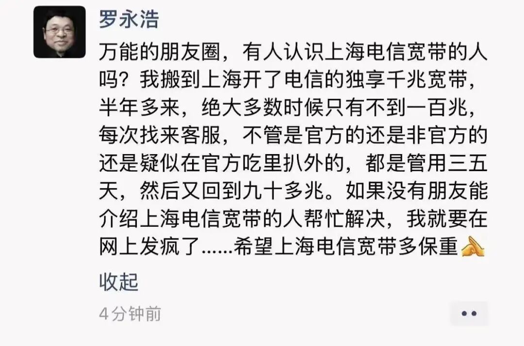 12月18日,罗永浩在朋友圈罕见点名上海电信,直言自己“再不解决,就要在网上发疯了”。