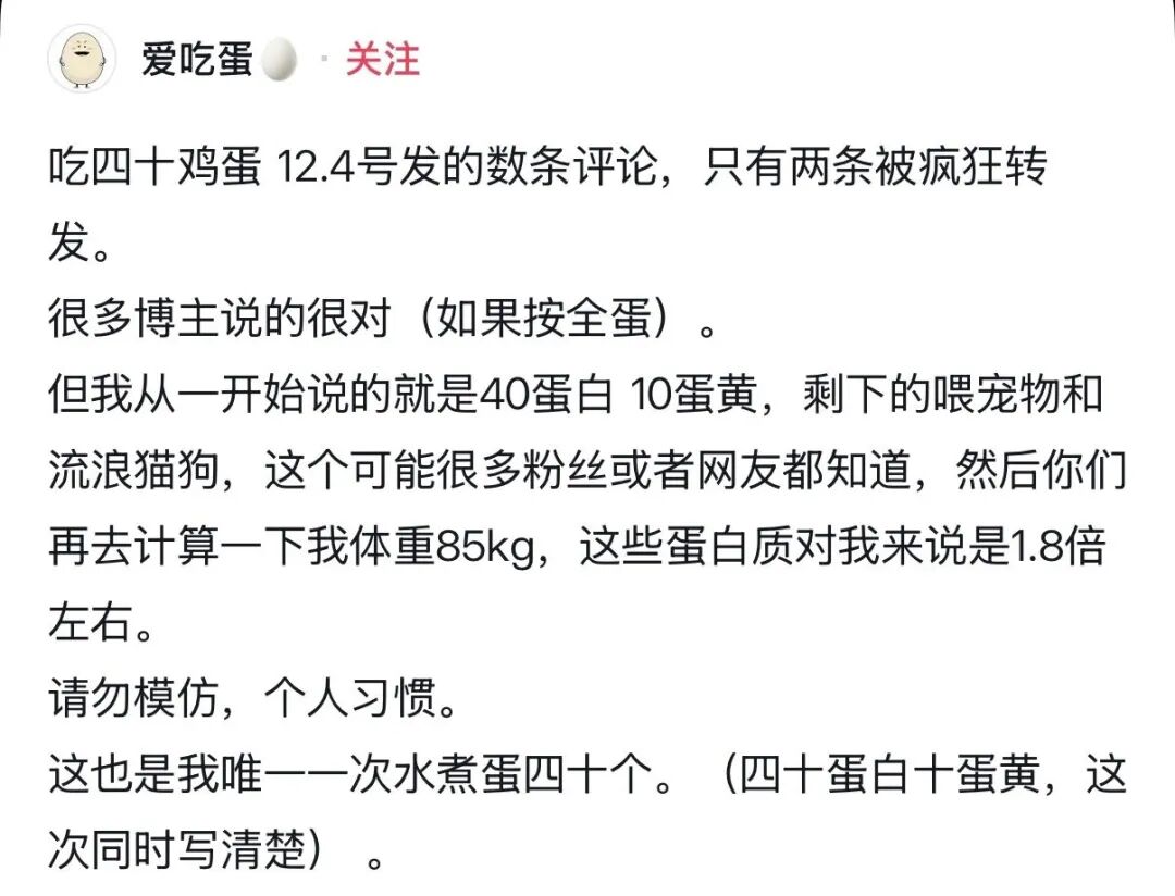 面对质疑,他无奈解释,自己是“一天吃40个蛋白+10个蛋黄”,而且部分蛋黄是喂宠物和流浪猫狗的,并不是全吃进自己肚子里。
