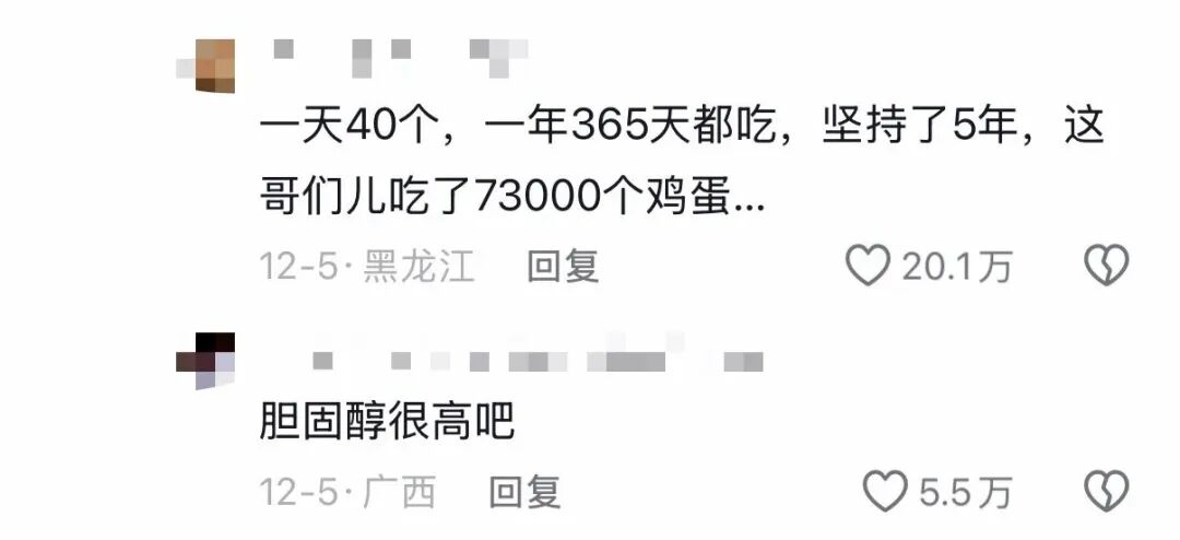 有网友算了笔账:一个鸡蛋约50克,40个就是2公斤,普通人根本消化不了,纷纷吐槽“为了博眼球瞎编”。