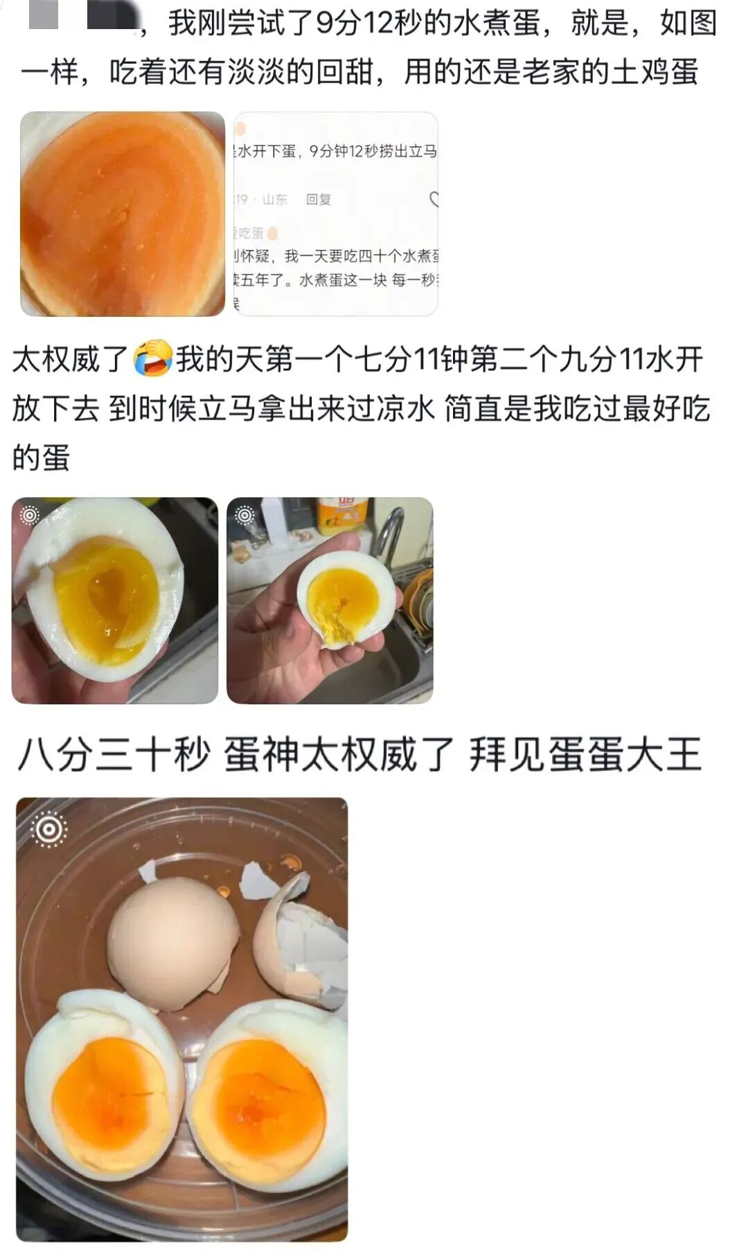 评论区里清一色求教程,就在大家对着屏幕流口水又无计可施时,一个顶着“爱吃蛋”ID的网友淡定冒泡:“水开下蛋,9分12秒捞出立马过凉水,就是这个效果。”