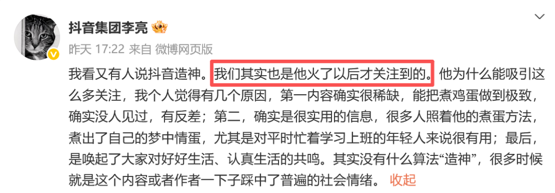 针对这个说法,抖音副总裁李亮直接出面否认,直言“不存在算法造神,只是他刚好踩中了普遍的社会情绪”。