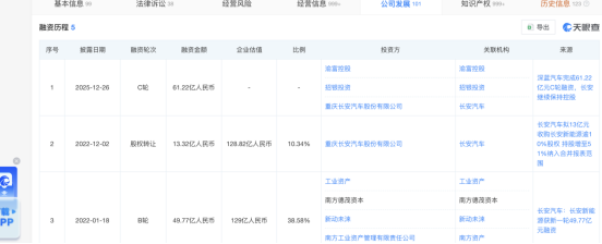 根据天眼查App显示,深蓝已经完成了4轮融资,最近的一轮,于去年年底完成了总额为61.22亿元的C轮融资,投资方包括长安汽车、重庆渝富控股集团及招银金融资产投资有限公司。