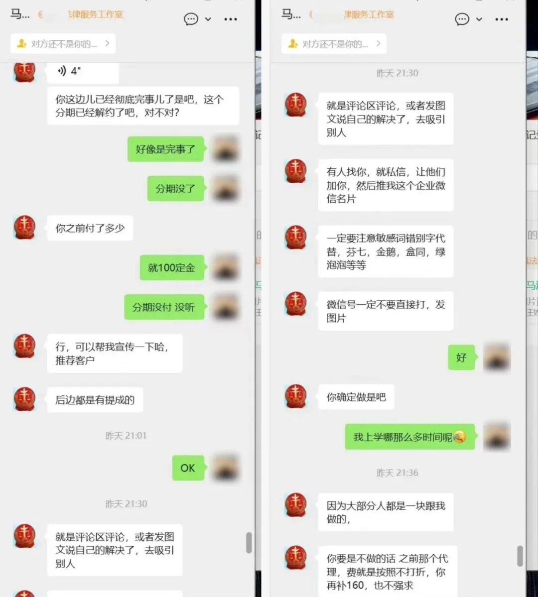 更让人唏嘘的是,得知分期取消后,这位马先生还让小文帮他宣传推广,“推荐一个客户10块钱”,并教他如何用“芬七”“盒同”“绿泡泡”等错别字规避平台敏感词。小文拒绝后,对方立刻变脸,要求他补齐160元“不打折的代理费”。小文果断将其删除。