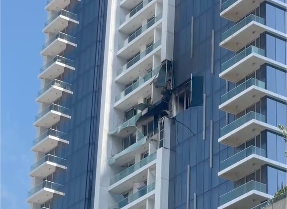 *无人机撞击大楼后留下的痕迹(视频截图,受访者提供)