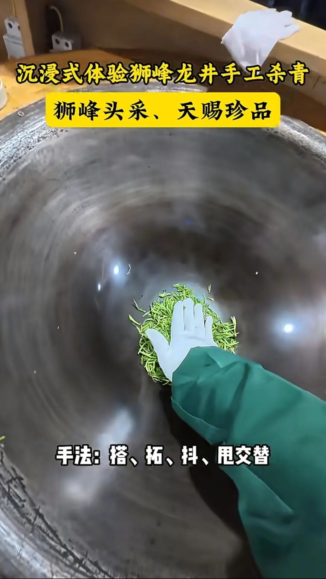 惊蛰研究所了解到,炒茶的锅通常有两百多度,炒茶的师傅在操作时不可以带任何防护,还用手反复翻炒茶叶直至茶叶烘干到理想的程度。所以,炒茶这项技艺本身就是掌握技巧和多年积累的结果。而炒茶的场景,本身也与西湖龙井的非遗炒制技艺高度相关。