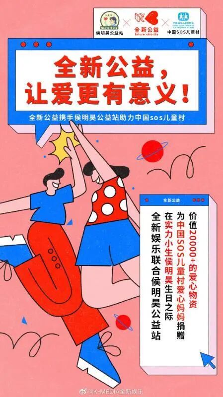 此外,全新娱乐致力公益项目的实践。今年4月份,发起全新粉丝公益月,联合郑爽、林彦俊、宋继扬、胡春杨、孙亦航等粉丝后援会,辐射数百万明星粉丝,活动曝光共达600万,在为期一个月时间,与粉丝一起,为抗疫医护人员、志愿军、环卫工人送上爱心物资,传达公益正能量。