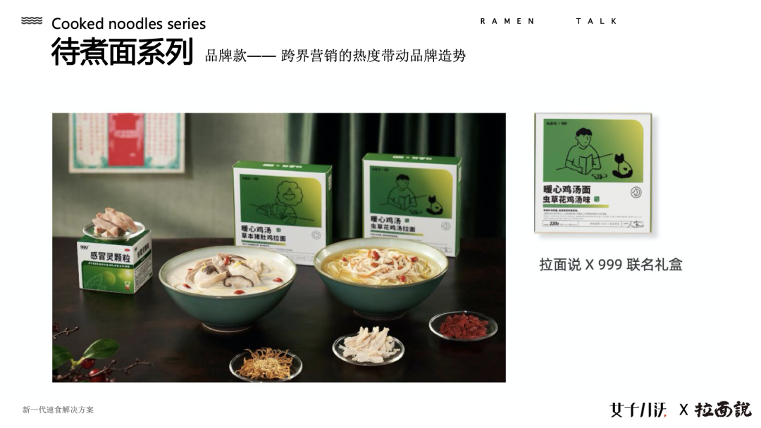 例如,和999感冒灵合作的「999 联名礼盒」、和米未小卖铺合作的「冬阴功拉面」、和网易未央合作的「猪肚鸡拉面」,和微信表情包联合推出的「吃好喝好长生不老」拉面礼盒,以及和B站旗下游戏《FGO》做了回馈用户的生日面。