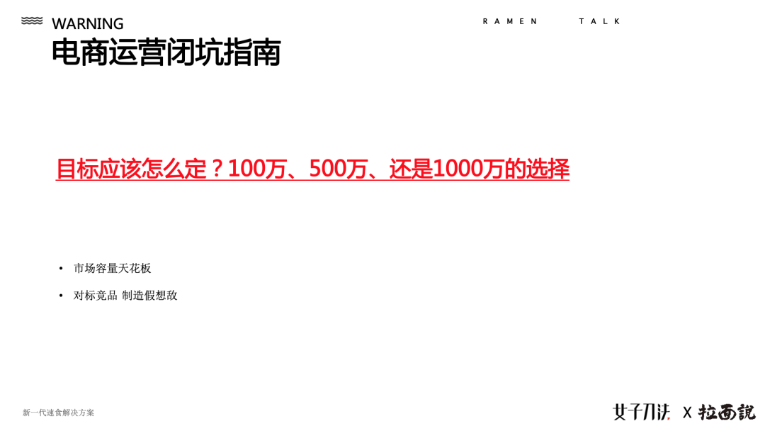 在这个阶段,拉面说在线上线下都获得了一系列数据。九一认为,在选定渠道和货品之后,如果想要确定月度的业绩目标,一定需要洞察市场容量的天花板。