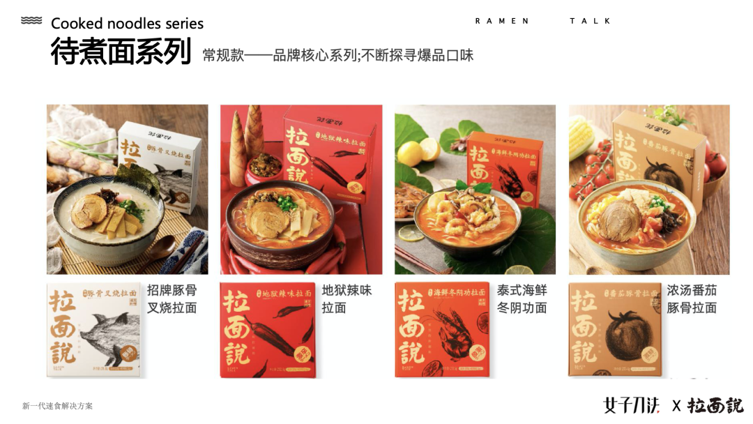 第一块,最经典的待煮面系列。这是拉面说的品牌核心系列,在保留四款最经典口味的同时,不断探寻新的爆品口味。