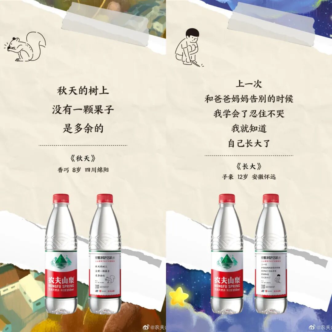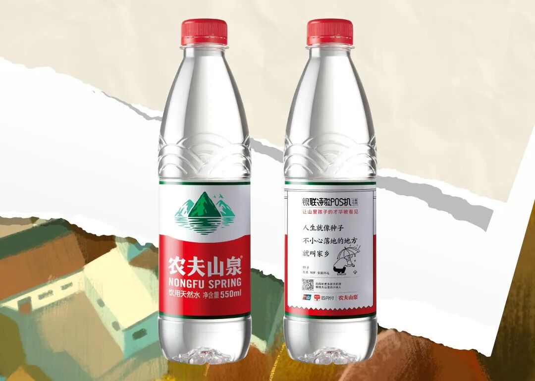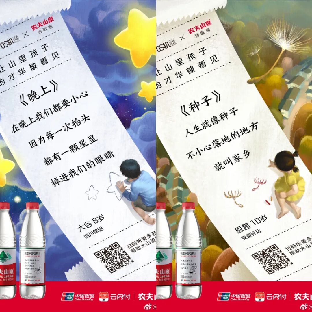 而就在近期,农夫山泉联合中国银联合作推出“诗歌瓶”,将山区孩子们写的诗印在超1亿瓶的农夫山泉饮用水瓶子上,旨在让更多人听到“来自大山里的声音”,暖得人们热泪盈眶。