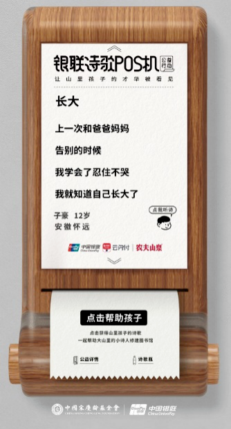 随着我国城市化进程的加快,解决好农村留守儿童问题,已成为社会热点问题,只有发动全社会的力量才能带来实质的改变,而这也正是银联通过诗歌POS机进行宣传的原因所在。