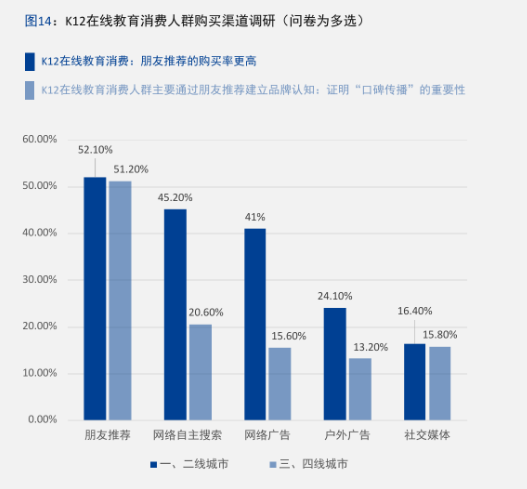 从整个K12在线教育市场表现来看,口碑传播的重要性越发凸显,盲目投放广告和低价策略消费者并不买账。2020年6月,中科院发布《中国K12在线教育市场概况》数据显示,超一半的K12消费人群主要通过朋友推荐建立品牌认知,其次是网络自主搜索和网络广告。此外,K12在线教育消费家长选择品牌时也看重平台口碑,其次是价格和师资。