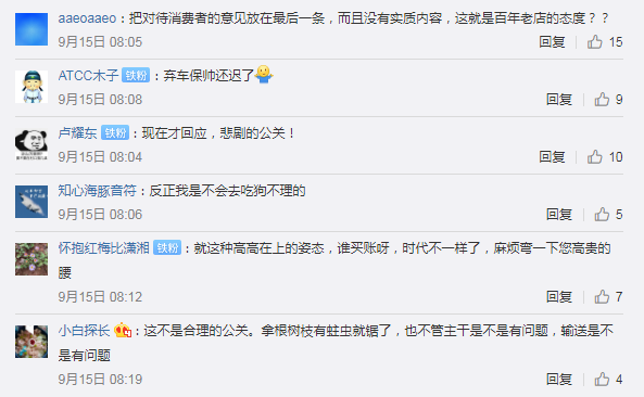 不过,网友似乎并不买账:“这就是百年老店公关手法,有问题就撇清关系”、“就这种高高在上的姿态,谁买账呀,时代不一样了,麻烦弯一下您高贵的腰”……