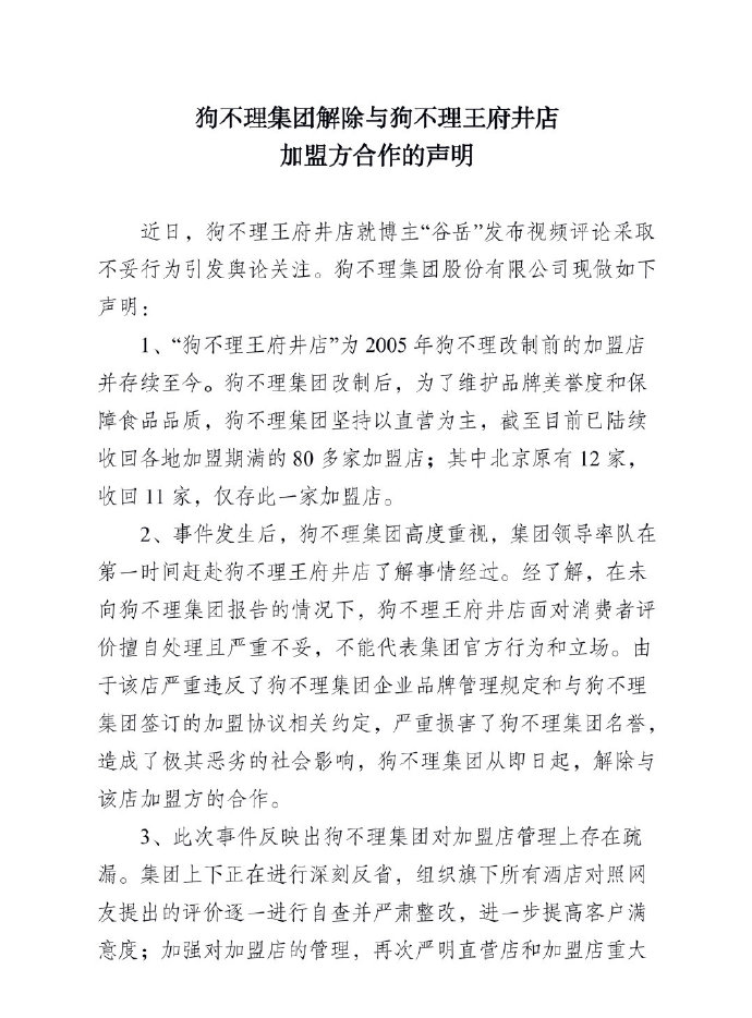眼看局面控制不住了,狗不理集团立刻出来发声,于9月15日凌晨2点,宣布解除与王府井店的合作关系。