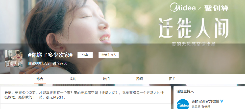 在片尾,美的空调露出广告语“愿迁徙的每一个你,下一站无风”,同样也是运用了一语双关的表现手法,这样不仅传达了产品力,也赋予了产品情感属性,为用户送去美好祝愿,展现美的空调暖心的品牌形象。除了发布微电影外,在线上,美的空调还打造了#你搬了多少次家#的话题,通过富有共鸣的话题引发受众参与讨论,与消费者做情感沟通,目前该话题已经获得了6881.7万阅读量和9700次讨论。