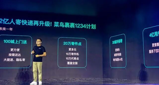 发布会上,菜鸟裹裹CEO李江华宣布“1234战略”:未来一年,100城寄快递可按需送达上门,20万寄件点将覆盖全国,30城上线环保袋,服务4亿用户。