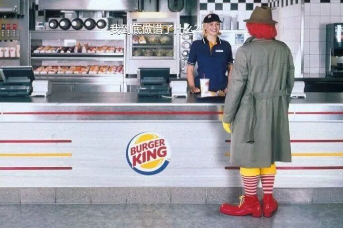 90年代时,汉堡王设计了一个平面广告,麦当劳叔叔来汉堡王买汉堡,文案很明显是暗讽麦叔叔不忠,乔装来买汉堡王。