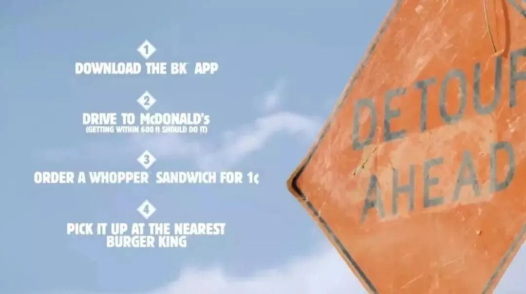 2019年初,汉堡王推出了1分钱汉堡的营销活动,消费者到麦当劳附近不到600英尺范围内下载汉堡王APP,然后通过汉堡王APP导航到附近的汉堡王门店取餐。