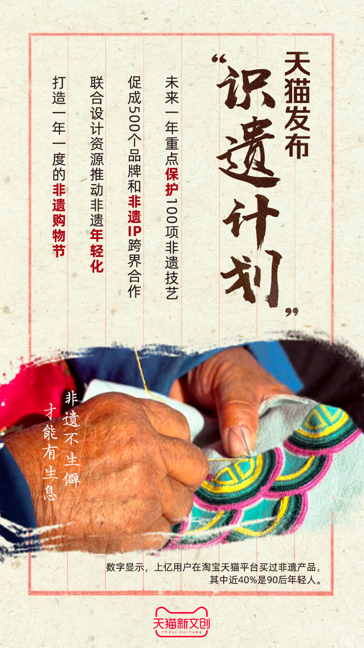 这是天猫发起的“识遗计划”,将在未来一年重点保护100项非遗技艺,促成500个天猫品牌和非遗IP进行跨界合作,同时联合中国美院等设计资源,推动非遗年轻化发展,打造一年一度的“非遗购物节”。