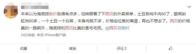 “何止海底捞,普遍都涨了。”无独有偶,同样身为明星企业的西贝莜面村近日也被眼尖的网友发现涨价了,甚至比海底捞涨幅更大。“本来以为海底捞涨价涨得有点多,转眼看了下西贝的外卖菜单,土豆条炖牛肉80了,酸菜封缸肉80多,海底捞和西贝比真的是毛毛雨。”