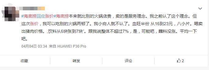 这场特殊时期的涨价,引发争议。支持者认为,眼下成本都在涨,再加上疫情受到巨大损失,“海底捞有涨价的权利,吃不吃是你们的选择”。而反对者的声音是,工资没涨,消费却涨了,不可思议。