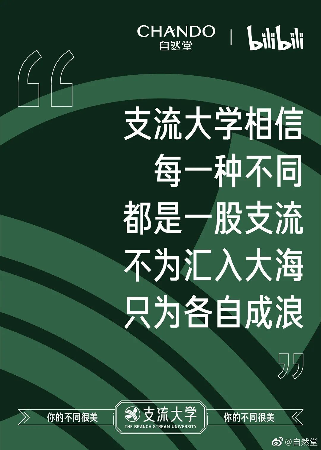 自然堂洞察到大自然中的某一条支流,不是主流,未必与其它支流汇聚为洪流,最终奔向大海。为了更好地将品牌宣言说到大众心坎上去,结合“支流”的特征,打造一个寓意深刻的“支流大学”概念,传达“把自己过成支流,让别人成为大海”:就算不走寻常路,只需要活出自己想要的样子,也能美出不一样的自己。