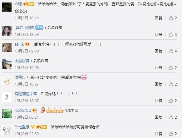 翻开麦当劳官博这支广告片的近300条评论,更多的网友表示了对新产品的期待,“后浪炸鸡!!!!何冰老师好可爱!!!”、“麦麦脆汁鸡!!!!何冰老师来打call啦!”是更多网友的反馈。