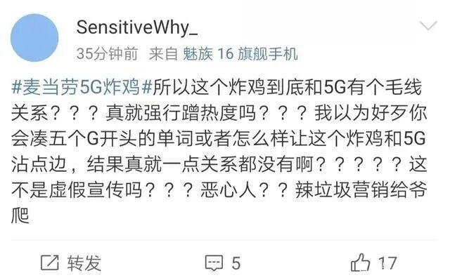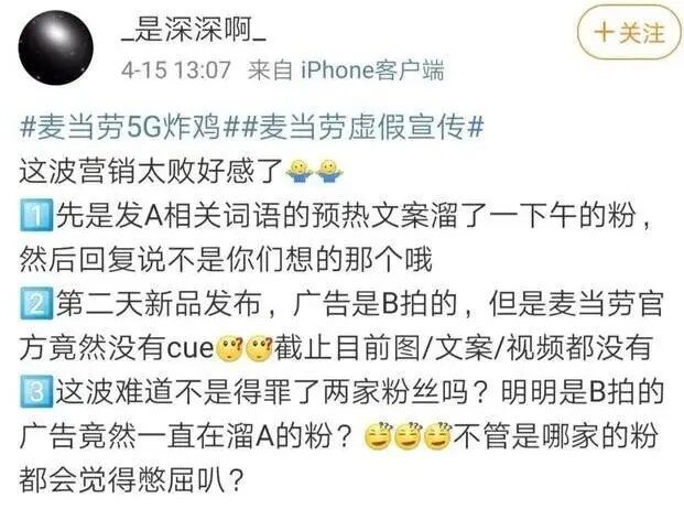 如果说麦当劳这次“后浪炸鸡”翻车还有讨论的余地;那上一次“5G炸鸡”与溜粉的翻车确实是实锤了。