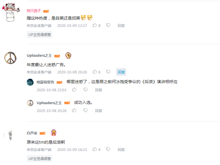 这不,这几天广告营销圈又都在讨论麦当劳与何冰合作的新广告《后浪》续集翻车的事儿。起因是麦当劳为推出一款“后浪炸鸡”新品,找来《后浪》主演何冰又拍摄了一部被网友冠以《后浪》续集——《后腿》的广告片。