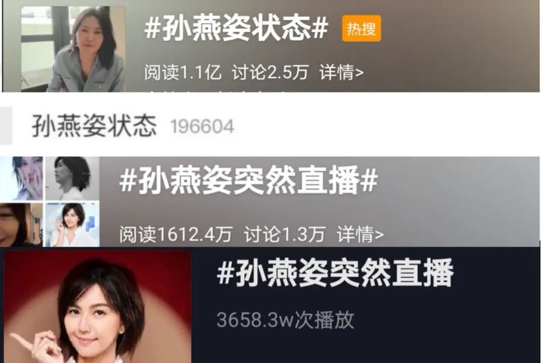 从官宣到亮相,一天之内全部完成。久未露面的孙燕姿一出现便喜提多个微博热搜。“孙燕姿状态”、“孙燕姿突然直播”等相关话题阅读量破亿,讨论量破万,实现了破圈传播,热度极高。