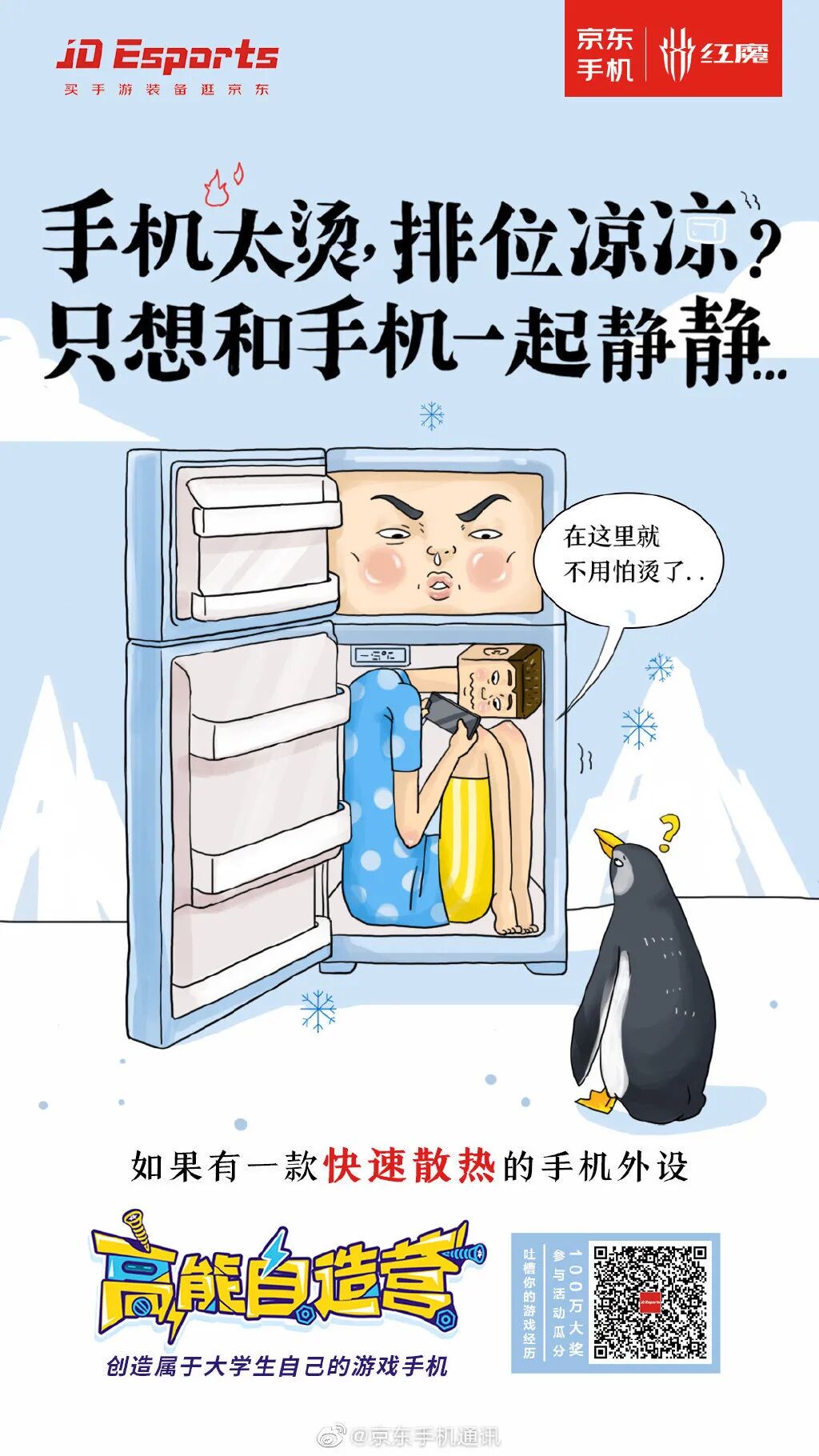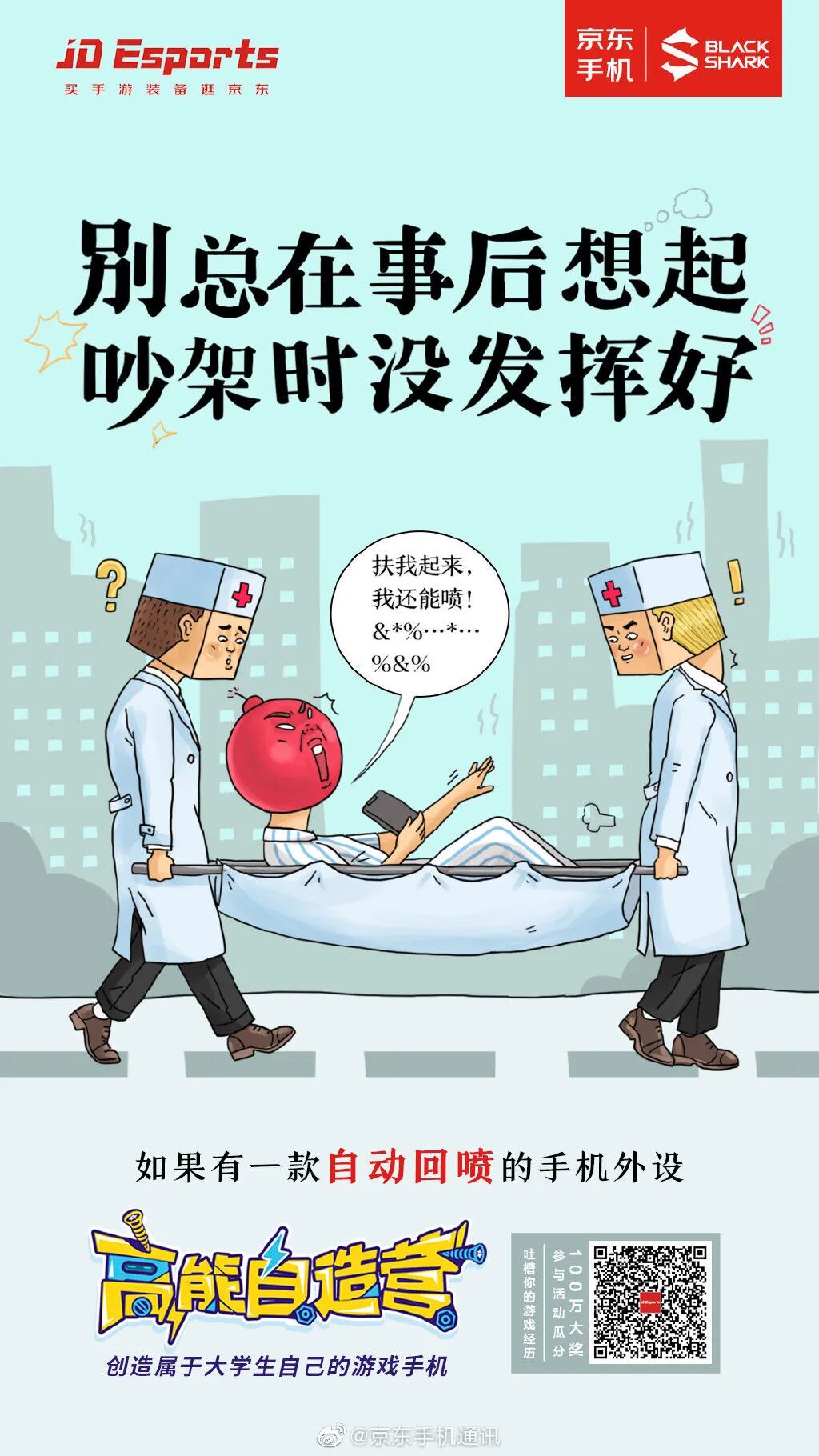 为此,在发布自造少年主题TVC的同时,京东手机还发布了几张#打手游吐槽大会#创意海报,将打游戏时遇到的真实崩溃场面作为灵感,通过插画的形式展现在大众眼前,并在海报底部给出舒缓吐槽欲的方案。