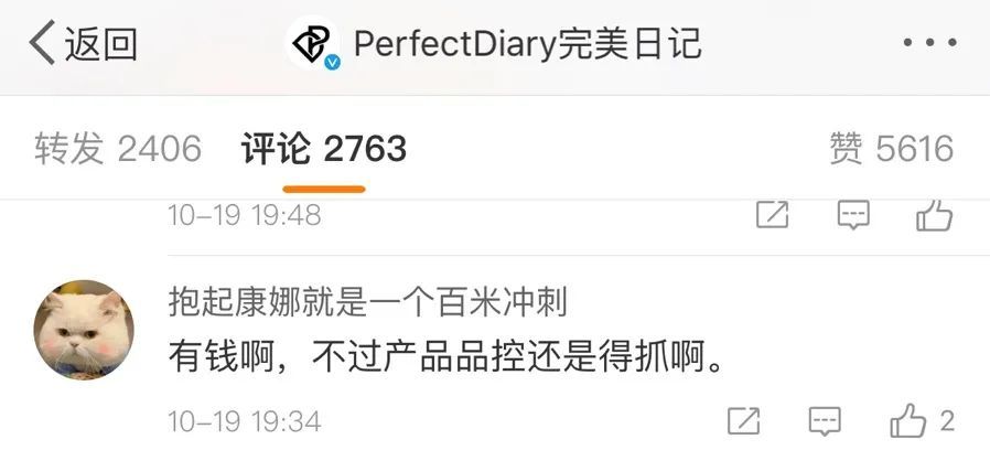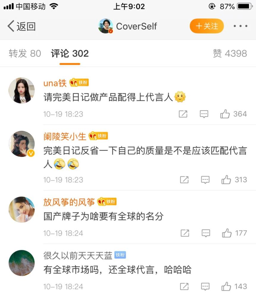 然而,官方微博下粉丝一片祥和,头部大V内容下却出现大量负面声音。很多网友直言“完美日记配不上周迅”、“请完美日记反省一下自己的质量是不是应该匹配代言人”、“怎么就到全球了?”...评论的背后,是对于通过国潮力量营销起家品牌们的一场集体“清醒”。