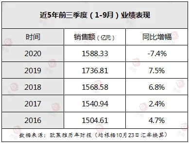 截至9月30日的2020年前三季度,欧莱雅实现销售额1588.33亿元,同比减少7.4%,排除汇率等因素影响,销售额同比减少8.6%。尽管欧莱雅全球的业绩在逐渐回温,但是从销售额的增幅上来看,是该集团业绩在5年以来的首次下滑。