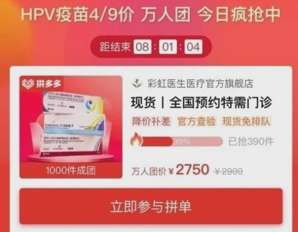 以“拼多多”为例,10月份,拼多多上线流感疫苗预约功能,地区范围辐射约有30多个城市,并宣称平台多为“现货疫苗”。实际上,这并不是拼多多第一次做疫苗生意。早在今年的4月份跟5月份,拼多多就曾先后三次以秒杀形式上线HPV疫苗。