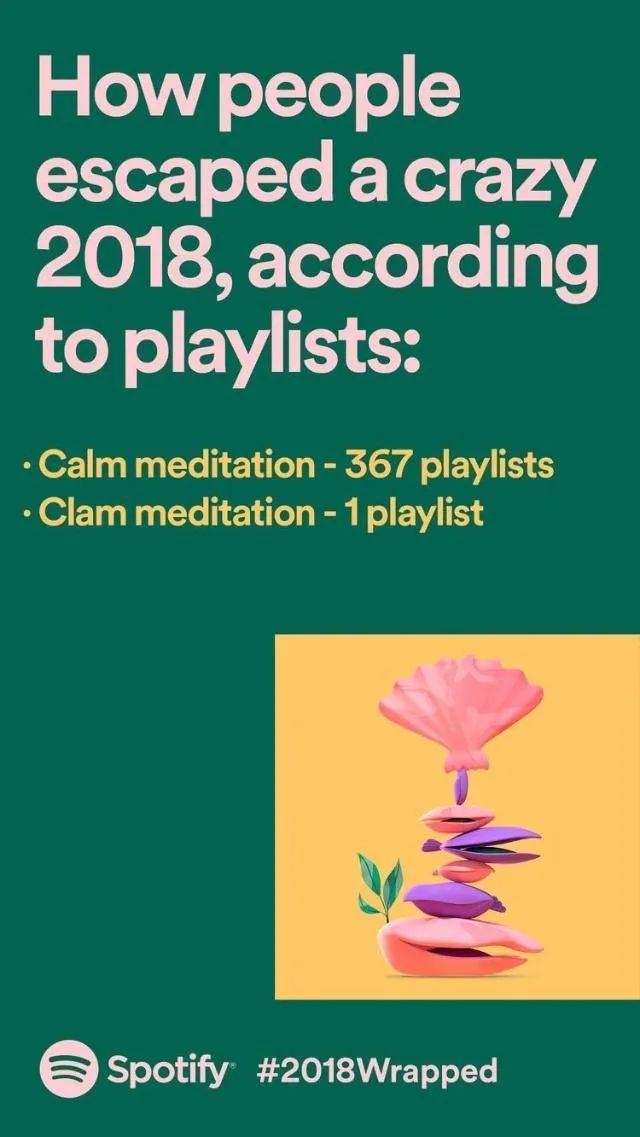 创建了367个安抚自己的平静冥想(Calm meditation)歌单,还有一个打错了的蛤蜊冥想(Clam meditation)歌单。