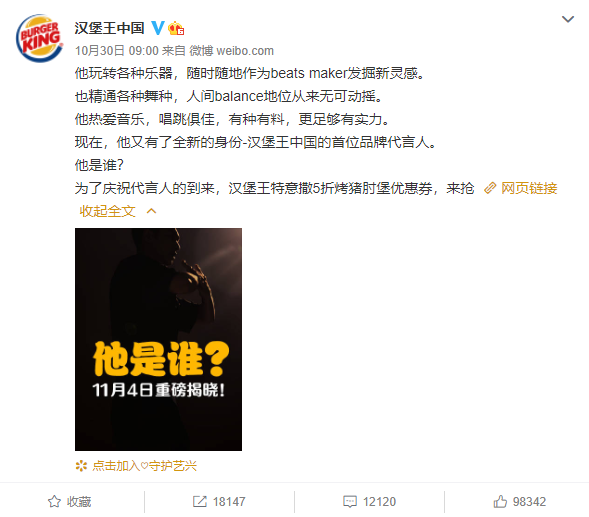 上周,汉堡王中国官方微博发布了其首位品牌代言人的消息,并未公布具体是谁,但网友及粉丝很快猜出图片里的正是张艺兴。