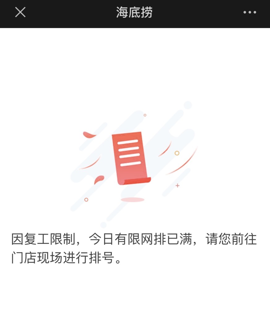 通过海底捞公众号预约订座很难成功,基本都是显示预约已满。门店人员对猎云网表示,现在公众号的预约都是下午4点准时开放,一共100个号,也可以选择电话预约,大概需要提前1周左右。